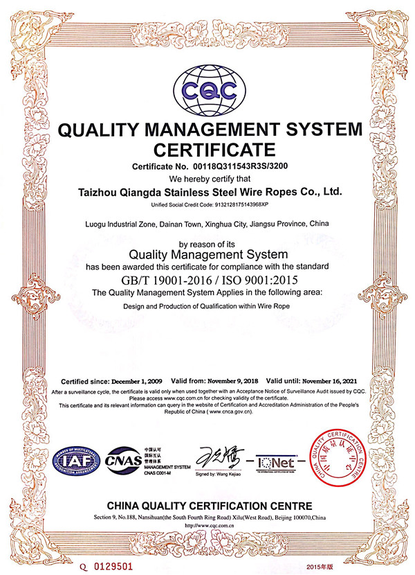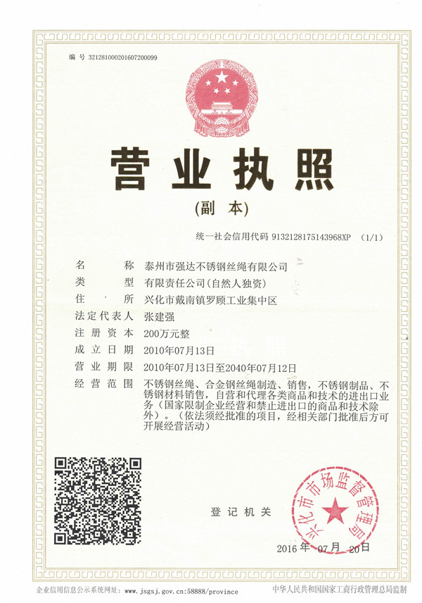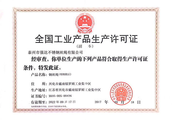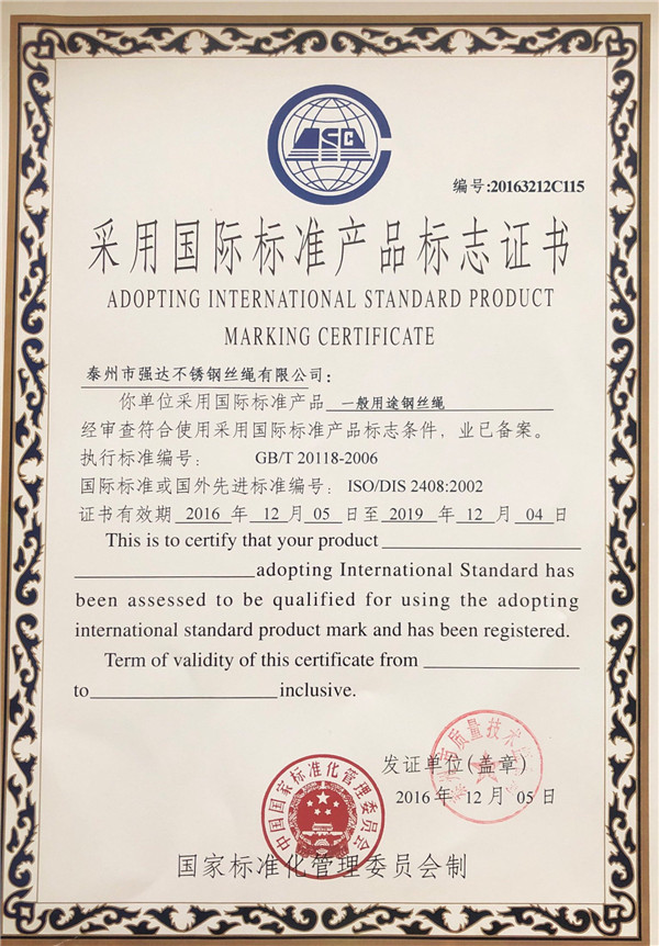 泰州市強(qiáng)達(dá)不銹鋼絲繩有限公司位于江蘇興化市戴南經(jīng)濟(jì)開發(fā)區(qū),公司致力于不銹鋼絲繩產(chǎn)品生產(chǎn),立志成為“國(guó)內(nèi)技術(shù)標(biāo)桿型吊索具生產(chǎn)企業(yè)”。以此戰(zhàn)略思想指導(dǎo),公司堅(jiān)決貫徹“質(zhì)量贏市場(chǎng),管理增效益,誠(chéng)信贏天下”的質(zhì)量方針。以完善的服務(wù)在國(guó)內(nèi)不銹鋼絲繩市場(chǎng)樹立良好的品牌形象。公司榮獲“江蘇省質(zhì)量信得過企業(yè)。     靈活的管理機(jī)制,經(jīng)驗(yàn)豐富的